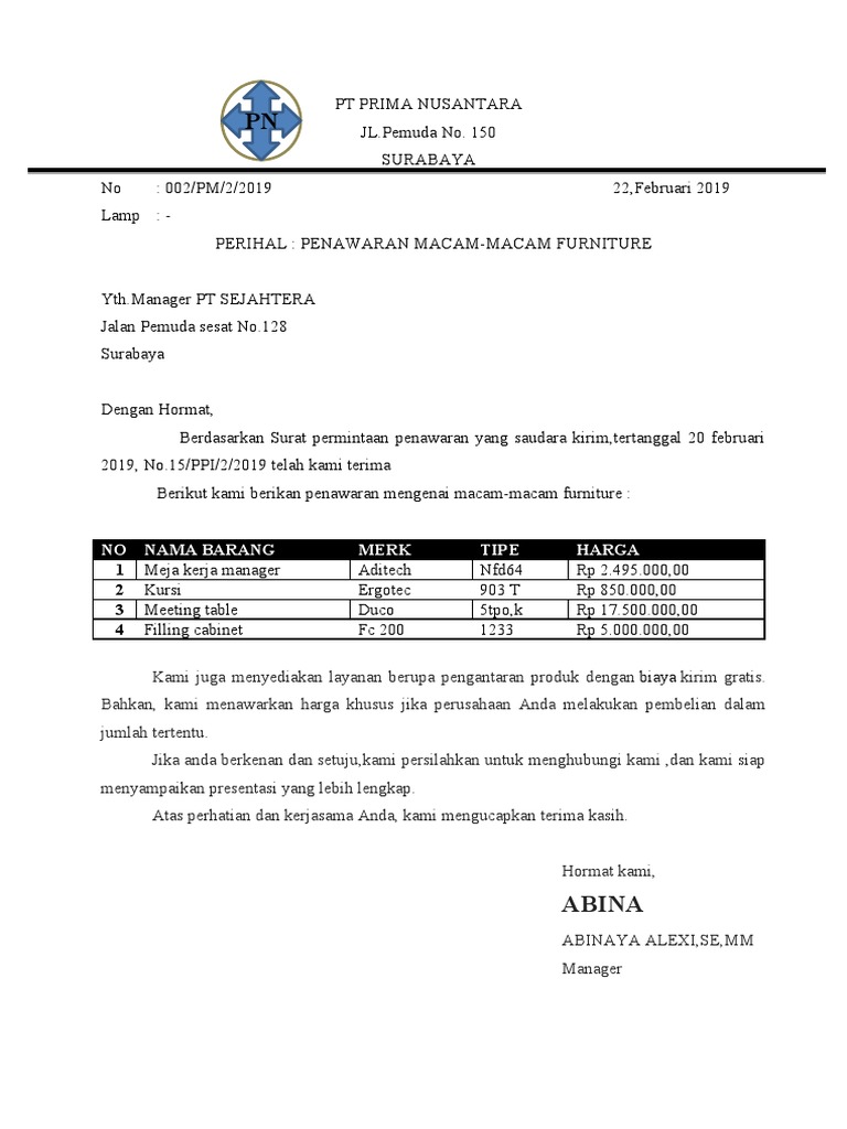Surat Penawaran Barang Pt Prima Nusantara / / Contoh surat penawaran kerjasama bahasa inggris.. Maksud dari pengiriman surat penawaran adalah untuk meyakinkan calon pembeli sehingga akan. Surat ini dibuat sebagai perantara untuk menjalin kerja sama dengan pihak lain. Contoh surat penawaran ini bisa dijadikan referensi. Contoh surat penawaran merupakan salah satu dari surat resmi yang sangat penting bagi seorang pengusaha, pedagang, jasa dan barang. Surat penawaran barang ini juga biasanya terdapat adanya sebuah permintaan dengan pihak klien terhadap perusahaan yang menjalin dan menawarkan barang dengan distributor untuk mengeluarkan surat penawaran nya.