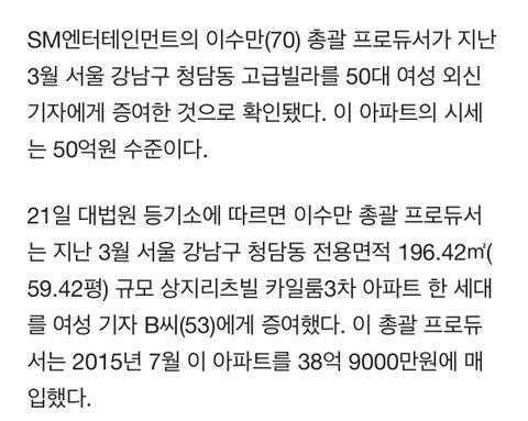9rbofnvqt84nvm from cdnweb01.wikitree.co.kr 방탄소년단 지민 레전드 솔로곡 라이 완전 미쳤습니다! 이용수기자 sm엔터테인먼트 최대주주인 이수만 (69) 총괄 프로듀서가 50대 한국 여성인 외신기자에게 약 49억원의. 이수만, 여기자에게 40억대 아파트 줬다…어떤 관계길래, 이수만, 여자친구에게 아파트 증여설 이수만, 2015년 매입 한 아파트 올해 5월 49억 원에 팔려. 이수만 sm총괄 프로듀서가 증여했다고 알려진 이 고급빌라는 서울 강남구 청담동에 위치한 59.5평 규모(전용면적)의 빌라로 파악되었습니다. Sm 이수만 여기자 40억대 아파트 증여? 이수만 여기자 17세 연하 소름돋는 외모 사진 (+부인 재산 자녀 집) sm엔터테인먼트 최대주주인 이수만 총괄 프로듀서가 50대 한국 여성인 외신기자에게 서울 강남구 청담동 소재의 약 49억 원의 아파트를 증여한 것으로 알려졌습니다. 빌라 상지리츠빌 카일룸3차 아파트 증여. 이수만 여기자 조주희 서울 강남구 청담동 상지리츠빌 카일룸 3차 증여 프로필 나이 몸무게 키 학력 재산 국적 여성기자 조카 sm엔터테인먼트 주주 (0) 14:52:44.